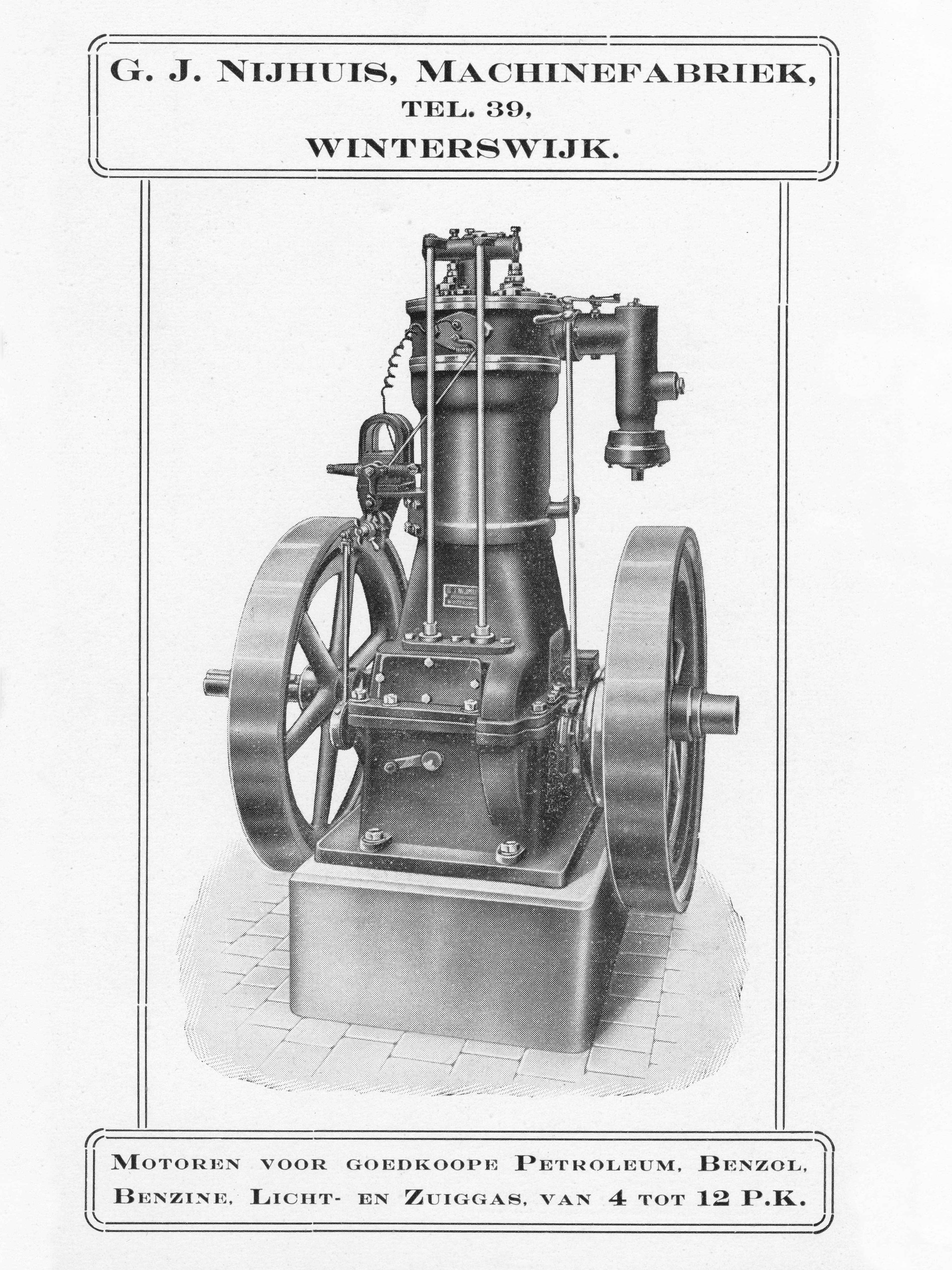 G.J. Nijhuis started his career as a folder at a steam bleaching plant in Boekelo, the Netherlands. But his technical passion soon led him to become a mechanic-fitter at a machine factory and foundry in Enschede. On April 5 1904, he co-founded Machine Factory Wolf & Nijhuis with Th. De Wolf, before establishing his own machine shop in Winterswijk in 1912. During the First World War, he pioneered the suction gas engines and ventured into the production of lightweight combustion engines. In 1917, his shop expanded with the addition of a foundry, and in the 1920s, he began production of slaughterhouse equipment and gas oven fittings for gas plants.
